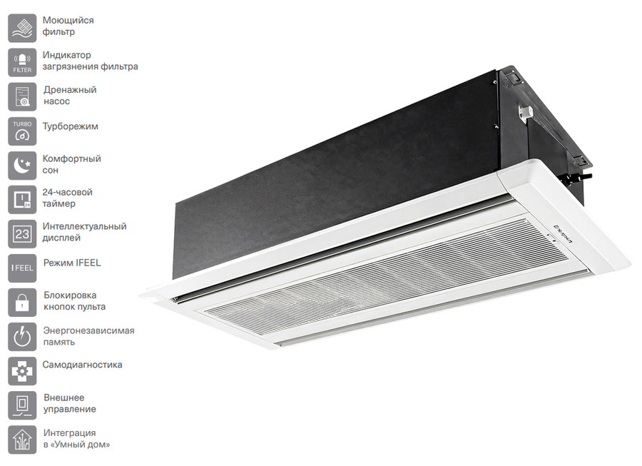 Модель двухпоточного кассетного внутреннего блока для VRF-систем Energolux (Энерголюкс) SMZ2C09V2AI* отличается компактным размером, но при этом эффективно распределяет воздушные массы по площади всего помещения. Устройство удобно настраивается с помощью пульта, и, благодаря таймеру на 24 часа, может быть запрограммировано на сутки вперед.